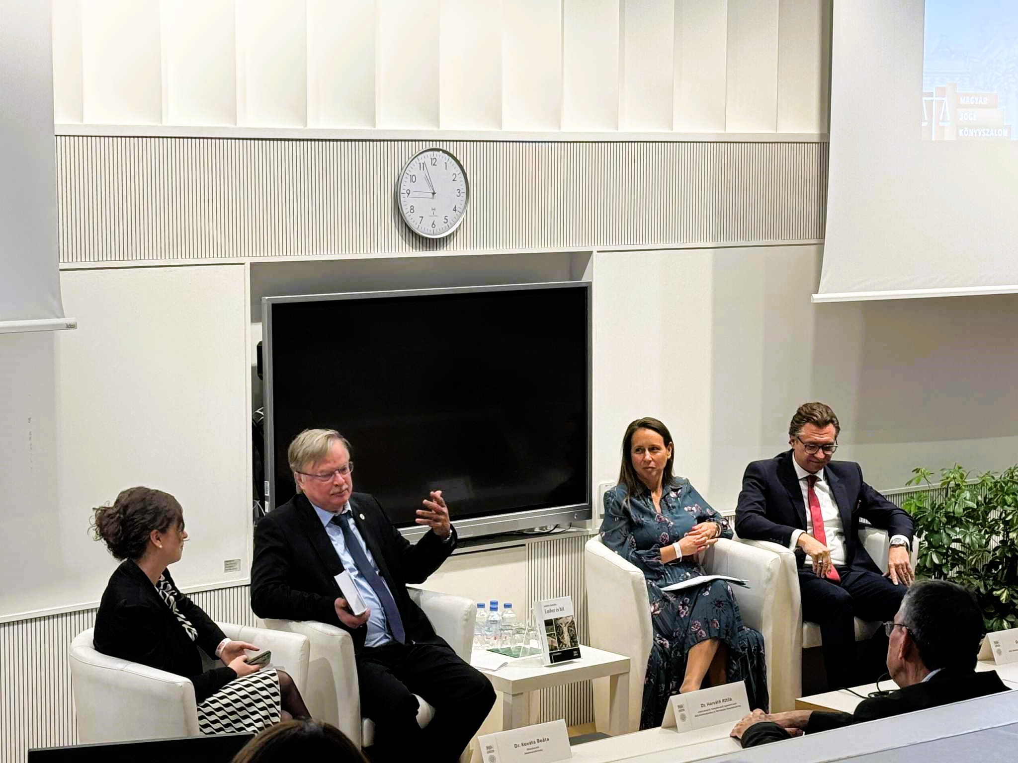Az egész napos programsorozatban pódiumbeszélgetések, könyvbemutatók és előadások váltották egymást. Az esemény különösen gazdag volt olyan tematikákban, amelyek nemcsak jogászokat, hanem a szélesebb közönséget is megszólíthatták. A Könyvszalon szakmai programjai közül több is mély gondolatokat hozott felszínre. „Ember és hit” címmel mutatták be Lenkovics Barnabás új kötetét, melynek kapcsán Prof. Dr. Horváth Attila, Dr. Varga Réka, Dr. Szabó Attila és Dr. Kováts Beáta beszélgettek arról, miként őrizhető meg az erkölcs és az emberi mivolt a jog világában. Megragadó volt Prof. Dr. Boóc Ádám hiánypótló kötete, a „Felelősség és immunitás a választottbíráskodásban”, amely első monográfiaként dolgozza fel a válaszottbírák felelősségével kapcsolatos kérdéseket. Dr. habil. Visontai-Szabó Katalin műve, „Fő- vagy mellékszereplő? A gyermek jogai, részvétele és képviselete az őt érintő polgári eljárásokban” szintén élénk szakmai érdeklődést váltott ki. A beszélgetés során felmerült a „gyermek ügyvédje” mint új jogintézmény lehetősége – egy olyan képviselőé, aki egyszerre rendelkezne jogi és pszichológiai felkészültséggel. A résztvevők hangsúlyozták: jelenleg nincs erre vonatkozó szabályozás, s a bíróságok gyakran próbálják pótolni ezt a hiányt, mivel az ügygondnoki intézmény nem képes betölteni e szerepet. Érdekes és filozofikus diskurzust eredményezett Dr. Balássy Ádám Miklós kötete, „A jogforrástan alapjai”, amely a jog mint nyelvi és társadalmi konstrukció természetének világába is kalauzol minket. A beszélgetésen Prof. Dr. Varga Zs. András, a Kúria elnöke, és Dr. Berkes Lilla egyetemi docens is részt vett. A vita során felmerültek jogértelmezési problémák jogalkotó és jogalkalmazó között, valamint a társadalom jogalkotásba való bevonásának nehézségei.