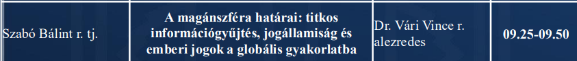 Saját dolgozatom a magánszféra határait elemezte a titkos információgyűjtés mint bűnüldözési és nemzetbiztonsági eszköz lencséje alatt. A központi hipotézisem szerint – ami a kutatás során igazolásra került – az adott jogállam minél speciálisabb eszközöket alkalmaz a titkos információgyűjtésre, annál általánosabb a jogi keretrendszer, amely jogalapot ad az alkalmazásra. Ez azt eredményezi, hogy a „klasszikus” titkos információgyűjtési metodikák (pl. a fedett nyomozó alkalmazása bűnszervezetbe beépülés céljával) egy átlátható, egyszerűen behatárolt keretben működnek, míg a modernizációs folyamat új termékei (mint pl. a szerb jogrend által használt IMSI-szkenner általi geolokáció) olyan keretrendszerben működnek, amelyek könnyen alapvető emberi jogokat korlátozhatnak aránytalan – és ezáltal jogszabályellenes – módon.