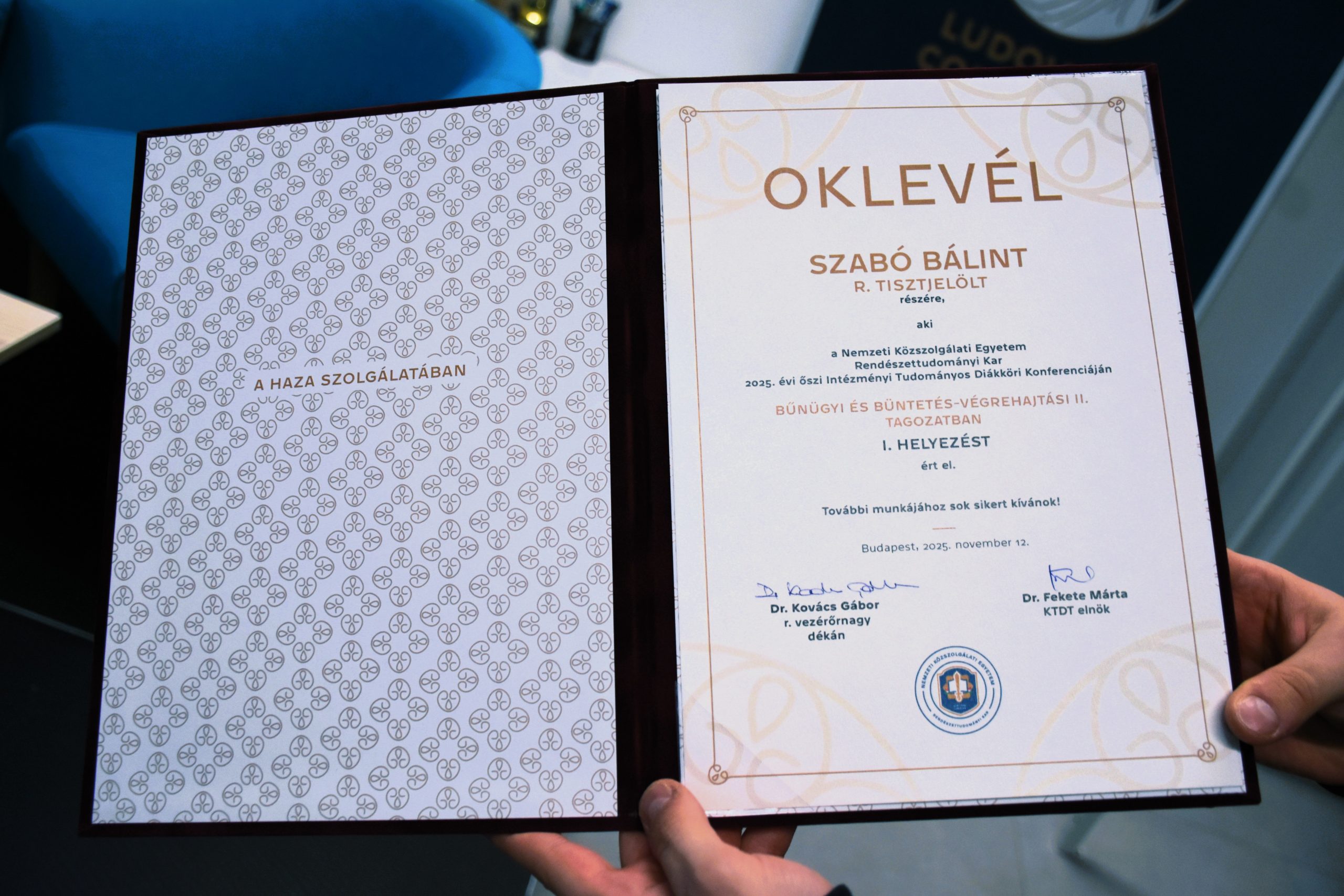 Az idei kutatásom a tagozaton belül első helyezést ért el, illetve ajánlásra került a 2027-es Országos Tudományos Diákköri Konferencián való előadásra. Ezt az érdemet a három dolgozatomból ezzel együtt kétszer érdemeltem ki, így az OTDK-n két szekcióban is képviselhetem a Nemzeti Közszolgálati Egyetem Rendészettudományi Karát.